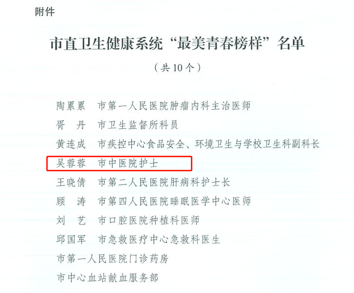 為深入學習貫徹習近平新時代中國特色社會主義思想,進一步弘揚五四精神,深入挖掘和展示市直衛(wèi)生健康系統(tǒng)各類優(yōu)秀青年典型,鼓勵廣大衛(wèi)健青年繼續(xù)投身鹽城衛(wèi)生健康發(fā)展新征程,市衛(wèi)健委在紀念五四運動100周年之際,開展了尋訪市直衛(wèi)生健康系統(tǒng)“最美青春榜樣”活動。經市直單位積極推薦并認真審核,結合網絡投票和現(xiàn)場展示的情況,授予10個優(yōu)秀青年或青年集體“最美青春榜樣”稱號,授予5個優(yōu)秀青年或青年集體“優(yōu)秀青春榜樣”稱號。我院吳蓉蓉榮獲“最美青春榜樣”稱號,陳杰、藥劑科門診中藥房榮獲“優(yōu)秀青春榜樣”稱號。